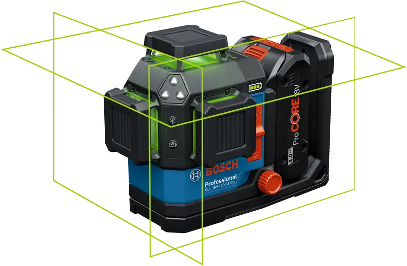 GLL 18V-120-33CGは、プロの現場でも使える高耐久性能と使い勝手の良さを求める方に最適なレーザー墨出し器です。