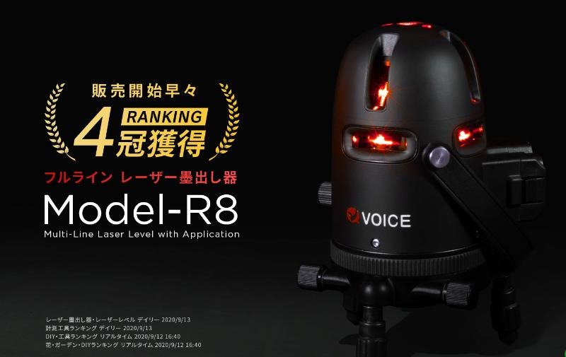VOICEのフルラインレーザー墨出し器 Model-R8 は、垂直4本ライン・水平360°・地墨点のフルライン照射に対応したモデルです。赤色可視半導体レーザーを光源に採用し、10mで±1mmの高い精度を実現しています。磁気制動式(ジンバル式)で安定した投影と±3°の自動補正機能により、傾いた設置でもラインを安定表示します。