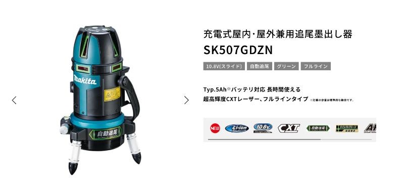 マキタのSK507GDZNは、屋内・屋外兼用の追尾機能付きフルラインレーザー墨出し器です。本体はグリーンレーザーを採用しており、明るい現場でも見やすいラインを表示できます。さらにリモコン追尾受光器に対応しており、大規模現場でもレーザー位置を自動追尾して基準出し作業を効率化します。10.8Vバッテリー対応で電動工具とバッテリーを共有でき、運用面でもメリットがあります。